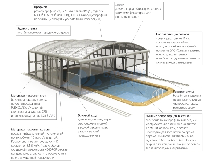 Вход в павильон осуществляется сбоку и располагается в самой большой секции. Он представляет собой раздвижную дверь купейного типа, оснащенную замком и детским предохранителем. В несъемной передней стенки находится откидная часть с надежным фиксатором. Боковые и торцовые стенки выполнены из прозрачного оргстекла, а крыша изготовлена из прозрачного десяти миллиметрового сотового поликарбоната (3,1Вт/м2K) с отделкой No Drop.
