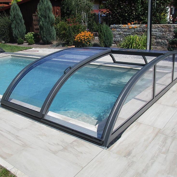 Раздвижные навесы для бассейнов серии «Flair» выделяются красивой формой дизайна. Индивидуальные дополнительные элементы для конструкции в виде: округлых профилей, торцевых пластиковых заглушек, скрытых креплений плат поликарбоната для торцевых стен, дверных проемов, секций навеса, выводят павильон для бассейна данной серии в премиум сегмент.