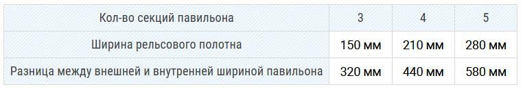 В таблице модификаций указаны внешние размеры павильона, по границе самой большой секции. Для расчёта допустимых размеров чаши, которой можно будет накрыть данным павильоном следует взять отступ по длине на 100 мм (толщина профиля торцевых стенок) и отступ на двойную ширину рельс.