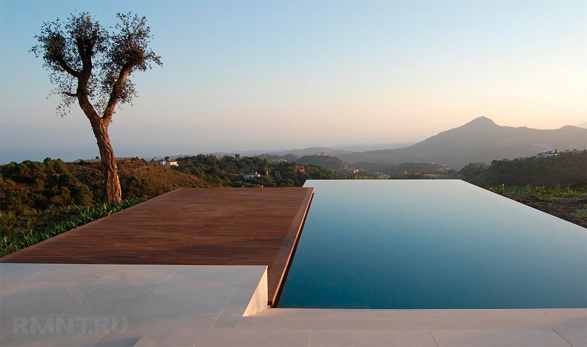 Главной особенностью в строительстве бесконечного бассейна является невидимый глазу второй уровень для перелива воды, благодаря которому создается эффект безграничного перехода водной глади в окружающий пейзаж.